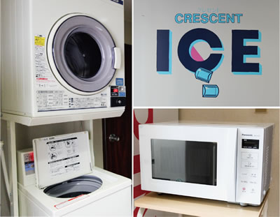 館内には電子レンジ(2台)、コインランドリー(洗濯&乾燥:4台)、製氷機などの設備をご用意しております。 お飲み物、カップ麺等の自動販売機もございます。