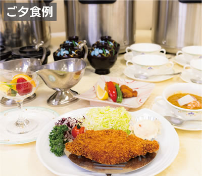 | ご夕食メニュー | ◎秋田八幡平ポークのとんかつ 彩りサラダ添え ◎若鶏肉の唐揚げ パプリカ添え ◎シーフードカレー ○豚汁 ○ご飯(秋田こまち) ○フルーツ ※連泊の場合は、◎主菜が変更になります。 (豚肉の生姜焼き・ハンバーグ・シーフードフライ・シチュー等々) |